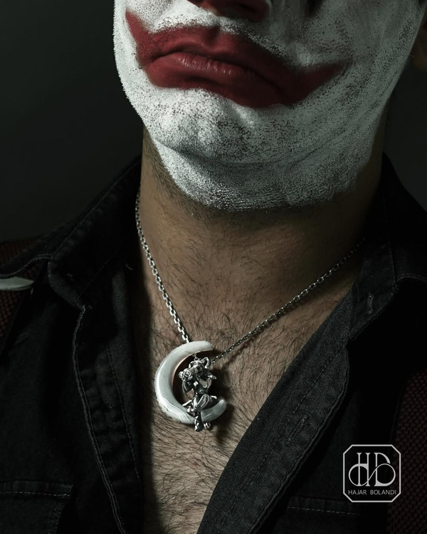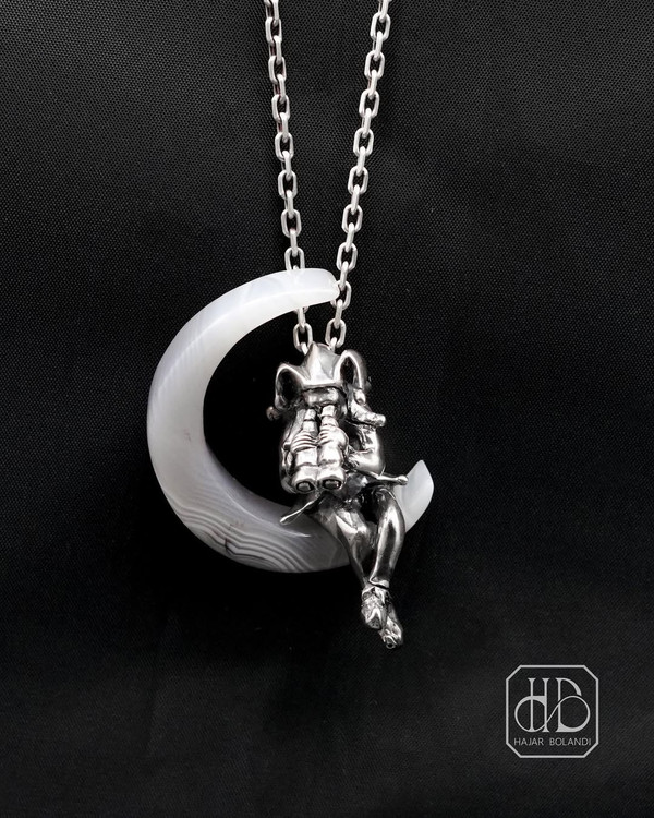 Lunar Trickster Where mischief meets moonlight. This hand-crafted silver pendant rests on a slice of real agate, shaped like a crescent moon — a quiet rebel watching the world from above. He doesn’t speak. He simply smiles. Now available at: bolandisilver.com JOKER COLLECTION #handcraft
