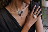 A delicate silver choker inspired by the spider maiden's elegance. It's articulated legs move with you - soft as silk, sharp as fate for those who seduce and ensnare without a word.